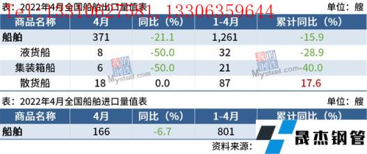 4月船舶進口166艘,同比減少6.7%;1-4月累計進口801艘,同比增長6.2%。