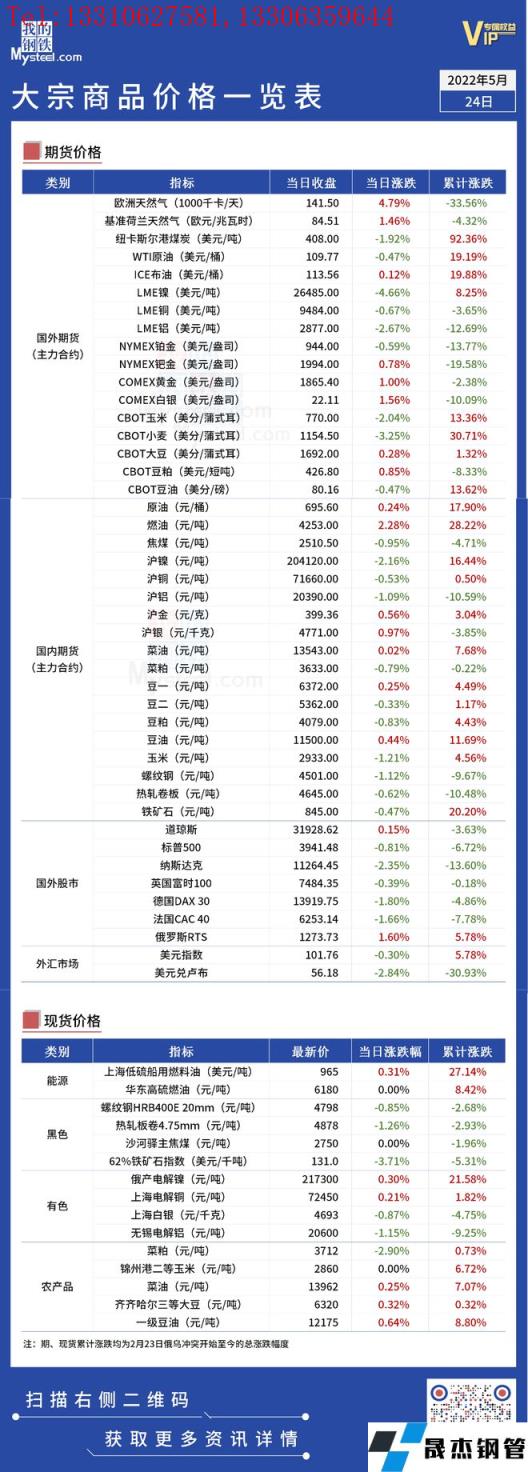 免責聲明:本網站(山東聊城晟杰無縫鋼管廠m.cuirutang.cn)刊載的“俄烏局勢丨大宗商品價格一覽表(5月24日)”等均源于網絡,版權歸原作者所有,且僅代表原作者觀點,本文所載信息僅供參考。轉載僅為學習與交流之目的,如無意中侵犯您的合法權益,請及時聯系刪除。本網站刊登此篇文章并不意味著本站贊同其觀點或證實其內容的真實性,我們不對其科學性、嚴肅性等作任何形式的保證。如果侵犯了您的版權,請盡快聯系我們予以撤銷,謝謝合作!