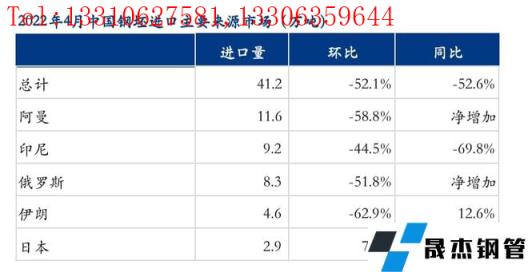如圖,中國進口鋼坯主要來自于阿曼、印尼、俄羅斯、伊朗和日本。其中,來自阿曼和俄羅斯的資源較去年增加,來自印尼資源則同比大幅減少。