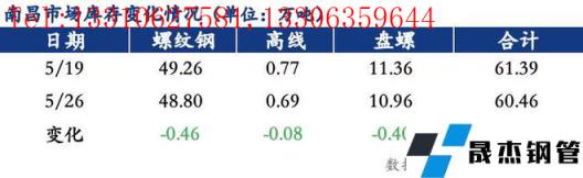 分品種來看,以南昌市場為例,本周南昌市場建筑厚壁無縫鋼管總庫存為60.46萬噸,其中螺紋鋼庫存為48.80萬噸,周環比減少0.46萬噸,降幅為0.93%;高線庫存為0.69萬噸,周環比減少0.08萬噸,降幅為10.39%;盤螺庫存為10.96萬噸,周環比減少0.40噸,降幅為3.52%。從資源占比來看,螺紋鋼資源占比80.72%,線盤資源占比19.28%,螺紋鋼占比較上周變化不大。