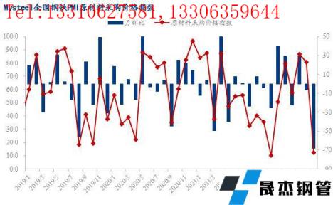 從相關(guān)指數(shù)來看,本月成品材出廠價(jià)指數(shù)大幅回落60.4個(gè)百分點(diǎn)至8.3,刷新年內(nèi)低點(diǎn),無縫厚壁鋼管廠家成品材庫存指數(shù)回落9.5個(gè)百分點(diǎn)至63.4,仍處榮枯線上方。同時(shí)成材價(jià)格下跌倒逼原料價(jià)格,本月原材料采購(gòu)價(jià)指數(shù)大幅回落68.5個(gè)百分點(diǎn)至12.1,國(guó)內(nèi)原材料采購(gòu)量指數(shù)回落6.6個(gè)百分點(diǎn)至45.3,國(guó)外原材料采購(gòu)量指數(shù)回落5.6個(gè)百分點(diǎn)至38.5。