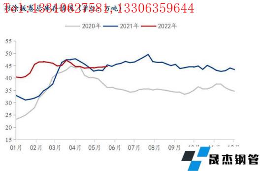 截止到5月底,彩涂板卷社庫(kù)28.87萬(wàn)噸,較上期減少0.16萬(wàn)噸。彩涂板卷總庫(kù)存44.7萬(wàn)噸,月環(huán)比增加0.48萬(wàn)噸,年同比減少1.26萬(wàn)噸。從數(shù)據(jù)上看,2021年5月份以后,彩涂板卷總庫(kù)存小幅上升。庫(kù)存的上升主要是因?yàn)槟壳跋掠涡枨笄闆r不佳,以及部分地區(qū)疫情導(dǎo)致的貨物運(yùn)輸受阻。