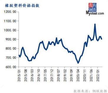5月份橡膠塑料價(jià)格指數(shù)為903.24,環(huán)比下跌2.66%,同比下跌1.08%。