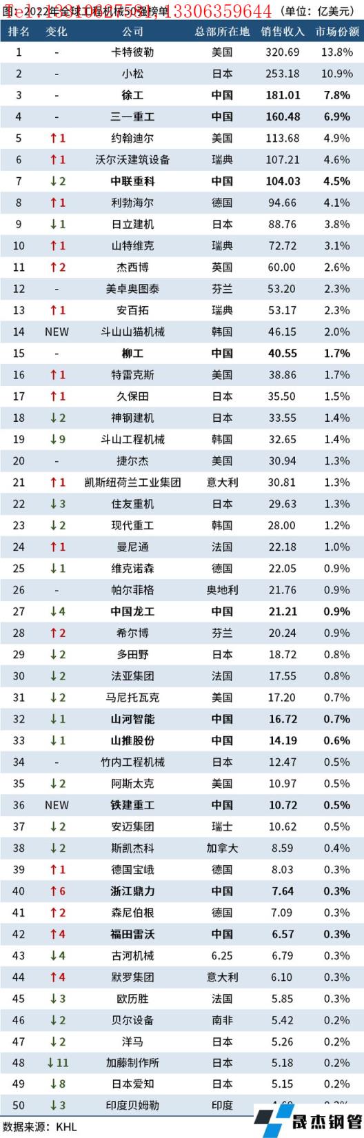 免責聲明:本網站(山東聊城晟杰無縫鋼管廠m.cuirutang.cn)刊載的“2022全球工程機械50強榜單出爐,企業銷售額增超20%”等均源于網絡,版權歸原作者所有,且僅代表原作者觀點,本文所載信息僅供參考。轉載僅為學習與交流之目的,如無意中侵犯您的合法權益,請及時聯系刪除。本網站刊登此篇文章并不意味著本站贊同其觀點或證實其內容的真實性,我們不對其科學性、嚴肅性等作任何形式的保證。如果侵犯了您的版權,請盡快聯系我們予以撤銷,謝謝合作!