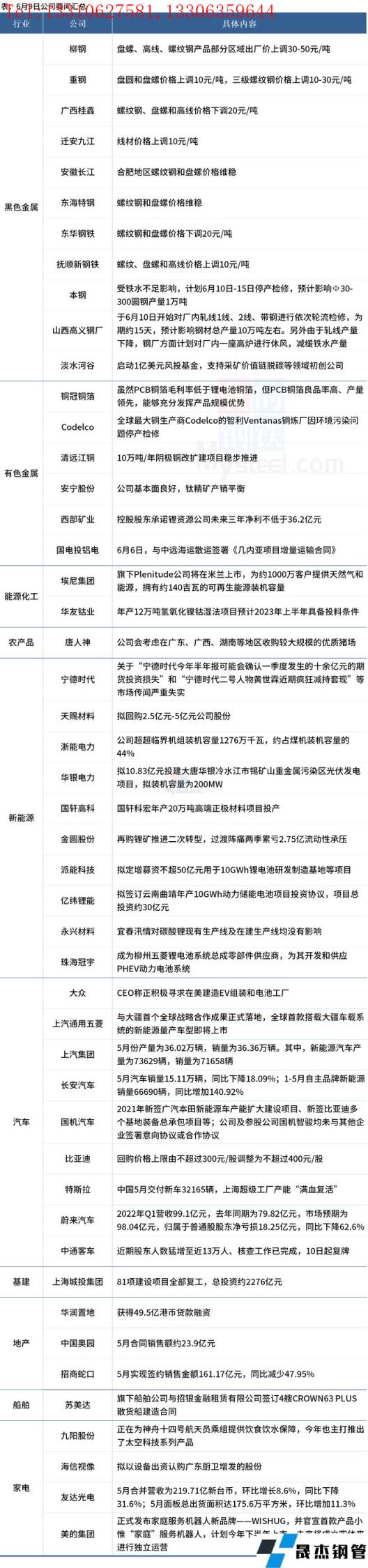 本鋼受鐵水不足影響,計劃6月10日-15日停產檢修;清遠江銅10萬噸/年陰極銅改擴建項目穩步推進;華友鈷業年產12萬噸氫氧化鎳鈷濕法項目預計2023年上半年具備投料條件;特斯拉中國5月交付新車32165輛,上海超級工廠產能“滿血復活”;蔚來發布Q1財報,營收增長,凈利潤下滑。