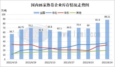 截止2022年6月24日,據(jù)云商平臺(tái)監(jiān)測(cè)數(shù)據(jù)顯示,國(guó)內(nèi)熱軋卷板社會(huì)庫(kù)存量約為264.53萬噸,環(huán)比增加20.82萬噸。重點(diǎn)城市庫(kù)存整體表現(xiàn)不一,華東區(qū)域受上海復(fù)工復(fù)產(chǎn)影響小幅消庫(kù)為主,華北、華南庫(kù)存持續(xù)累庫(kù)。具體來看,廣州地區(qū)熱卷社會(huì)庫(kù)存量約為71.00萬噸,環(huán)比增加9.09萬噸;上海熱卷社會(huì)庫(kù)存量環(huán)比下降4.84萬噸至37.00萬噸;天津熱卷社會(huì)庫(kù)存量約為8.00萬噸,環(huán)比增加0.80萬噸。
