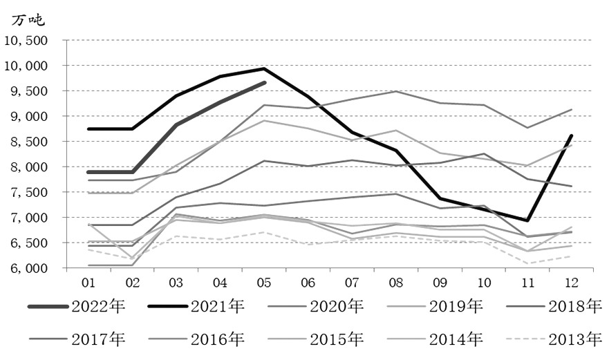 在過去近20年的時間中,我國粗鋼產量呈現逐年上升趨勢。2013年,我國粗鋼月均產量為6454.8萬噸。而今年1—5月,我國粗鋼月均產量達到8712.7萬噸。