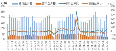 圖2 2017-2022年乘用車(chē)和商用車(chē)月度產(chǎn)量及同比增速