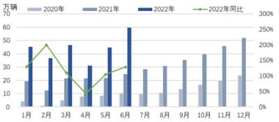 6月份,新能源汽車(chē)產(chǎn)銷(xiāo)分別完成59萬(wàn)輛和59.6萬(wàn)輛,同比均增長(zhǎng)1.3倍,產(chǎn)銷(xiāo)量同比增速明顯回升。1-6月份,新能源汽車(chē)產(chǎn)銷(xiāo)分別完成266.1萬(wàn)輛和260萬(wàn)輛,同比均增長(zhǎng)1.2倍,市場(chǎng)占有率21.6%。中汽協(xié)預(yù)計(jì),2022年新能源汽車(chē)銷(xiāo)量有望達(dá)到550萬(wàn)輛,同比增長(zhǎng)56%以上。