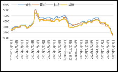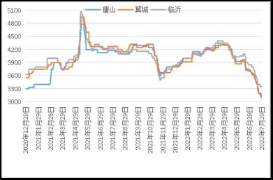 據云商平臺監測數據顯示,截至7月29日,煉鋼生鐵天津地區報價3120元(噸價,下同),較月初跌550元;唐山地區報價3150元,較月初跌550元;翼城地區報價3100元,較月初跌620元;臨沂地區報價3350元,較月初跌500元(詳見圖2)。