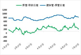 7月焊管較帶鋼價(jià)差,鍍鋅管較焊管價(jià)差走勢(shì)趨于一致。月中階段走擴(kuò)后,價(jià)差空間再次收窄,月末焊管與原料價(jià)差收窄幅度大于鍍鋅管。目前管廠廠內(nèi)原料輪換周期拉長至20天左右,部分規(guī)格拉長至1個(gè)月之久,月內(nèi)出現(xiàn)停購原料3-5天的情況。結(jié)算周期內(nèi)焊管生產(chǎn)利潤平均盈利29元,架子管平均虧損7元;鍍鋅管較焊管價(jià)差收縮91元,管企綜合生產(chǎn)利潤改善不明顯。