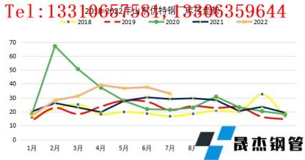 導語:7月份國內優(yōu)特鋼市場價格大幅下跌。進入7月份后,隨著北方高溫天氣和南方雨季的到來,鋼市正式進入了需求淡季,疊加疫情反復影響,導致整體需求不佳。月內宏觀消息面喜憂參半,擾動市場行情。近期外圍加息消息不斷,歐洲央行11年來首次加息(加息50個基點),9月份可能繼續(xù)加息;美聯(lián)儲再次加息75個基點,整體經濟氛圍仍偏悲觀,在一定程度上阻礙了價格的持續(xù)上行。