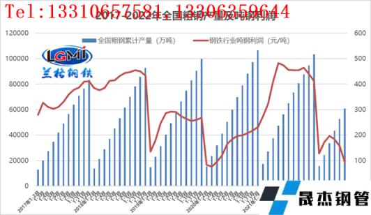 圖1 2017-2022年全國粗鋼產量及噸鋼利潤